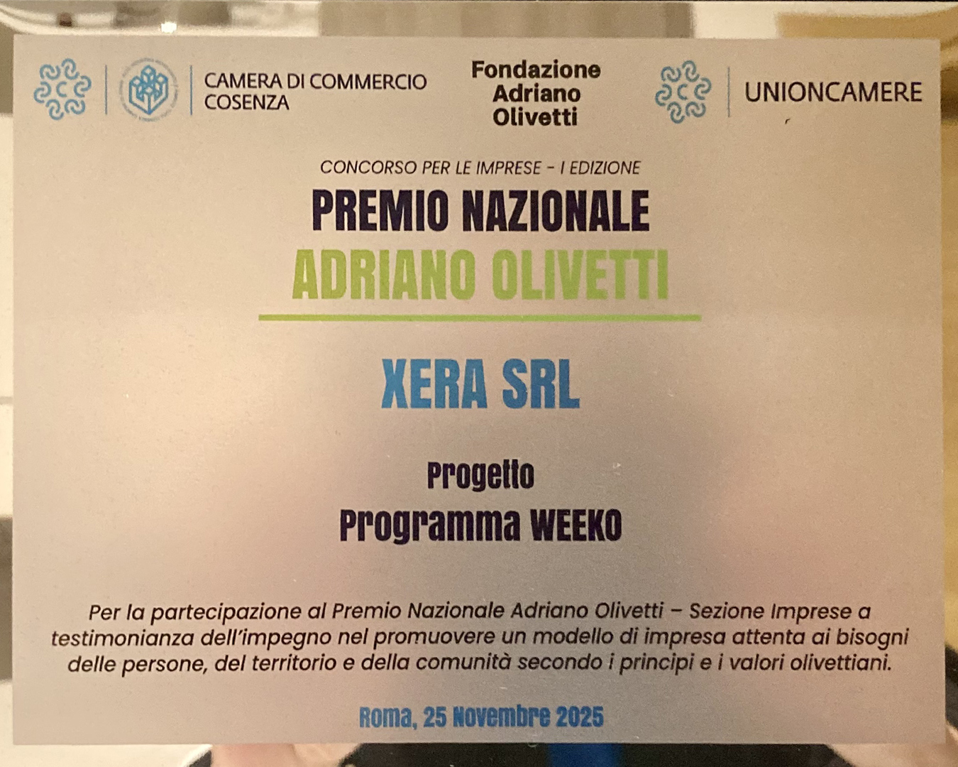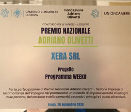Siamo orgogliosi di annunciare che Xera ha ricevuto il Premio Nazionale Adriano Olivetti 2025, nella sezione “Impatto sul territorio”, un riconoscimento che celebra l’impegno concreto delle organizzazioni capaci di generare valore sociale, ambientale ed economico all’interno delle comunità in cui operano.